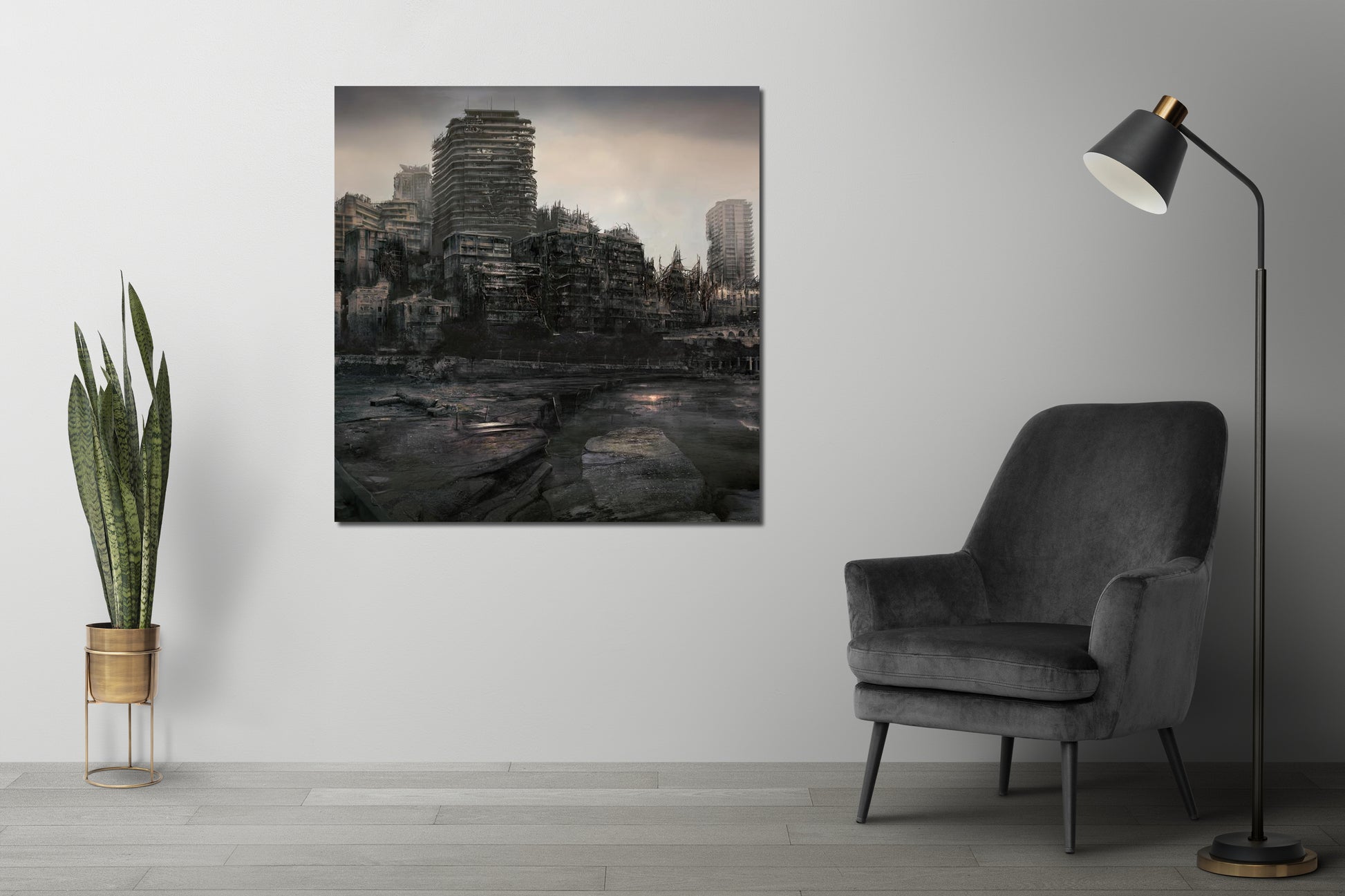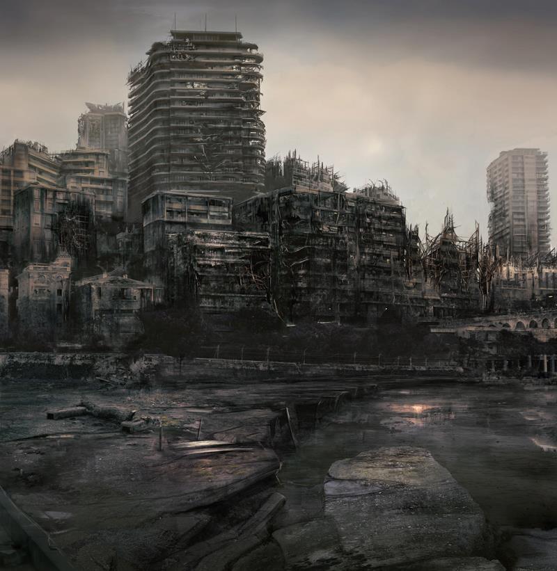 James's attention to detail is impressive, with every element of the scene showing the devastating effects of an unknown disaster. The sky is filled suggesting the air is toxic, while the buildings are stripped bare of their former beauty, with broken windows and crumbling facades.