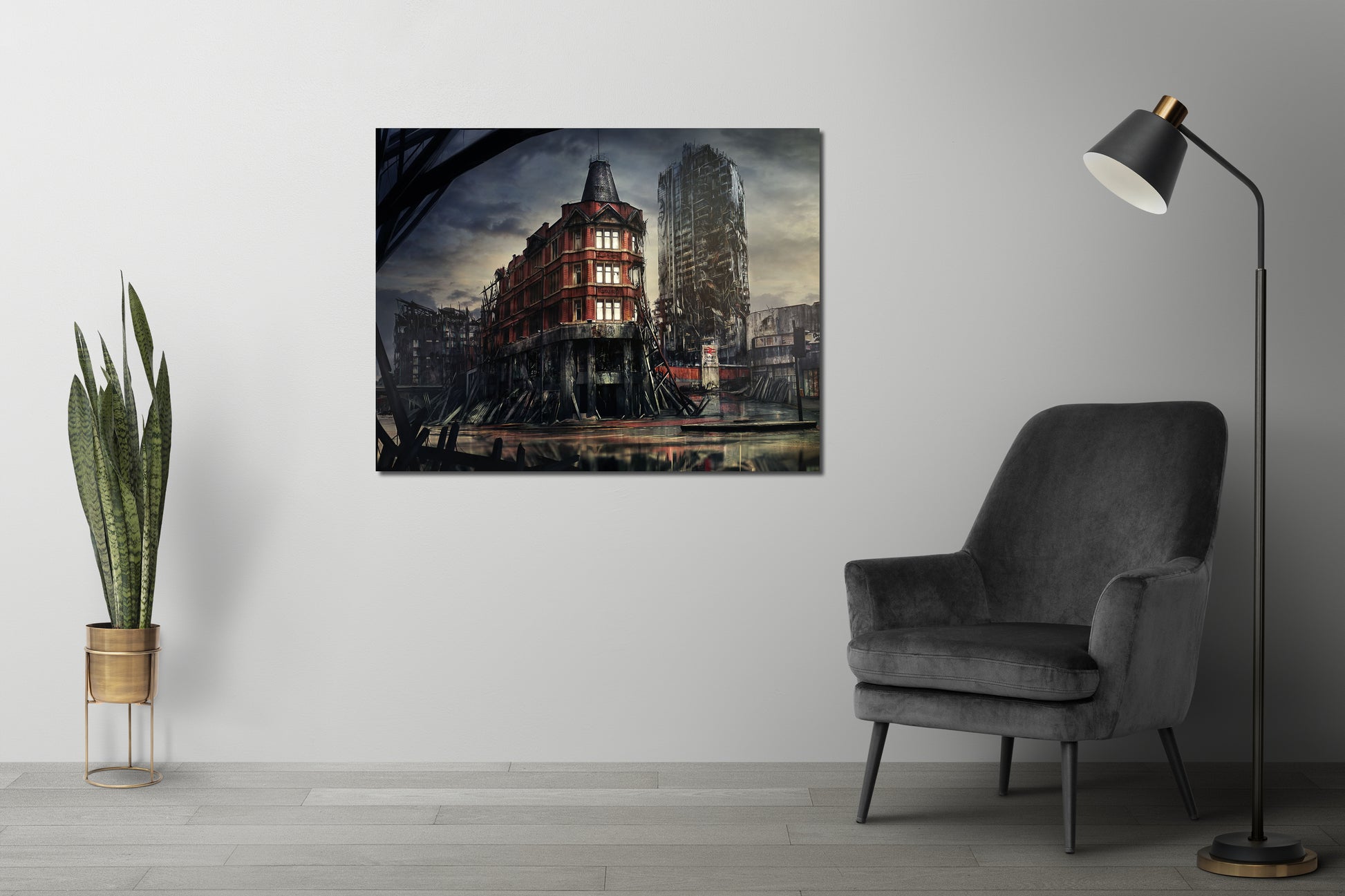 James Chadderton's post-apocalyptic artwork depicts the iconic Cornerhouse building in Manchester in a state of decay and ruin. The mixed medium format allows for a gritty and textured depiction of the once-vibrant cultural hub, now a shell of its former self.