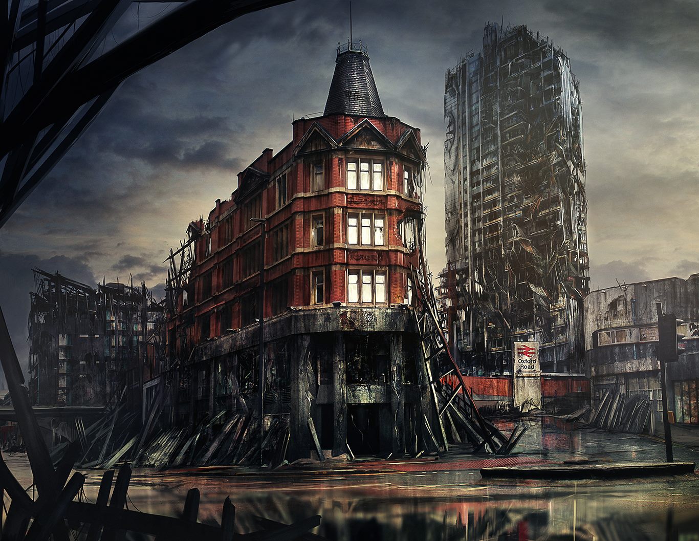 The artwork captures the aftermath of an imagined disaster, with the building's walls cracked and crumbling, its windows shattered and boarded up, and its exterior covered in layers of graffiti and overgrown foliage. The scene is haunting, evoking a sense of desolation and abandonment.