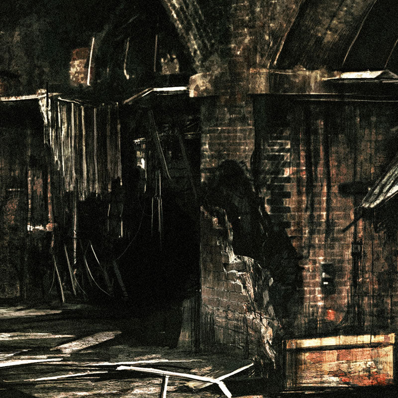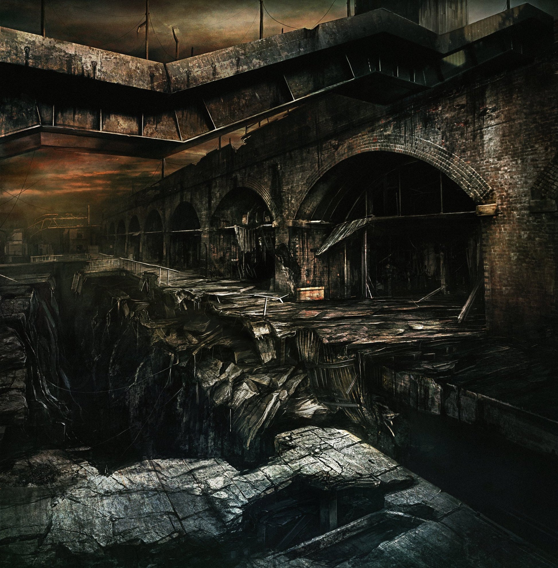 The painting depicts the once-bustling Deansgate Locks, now in a state of disarray following an unspecified cataclysmic event. The scene is set against a backdrop of ominous, smoke-filled skies, with abandoned buildings. The colors are muted and desaturated, adding to the overall sense of bleakness and decay.