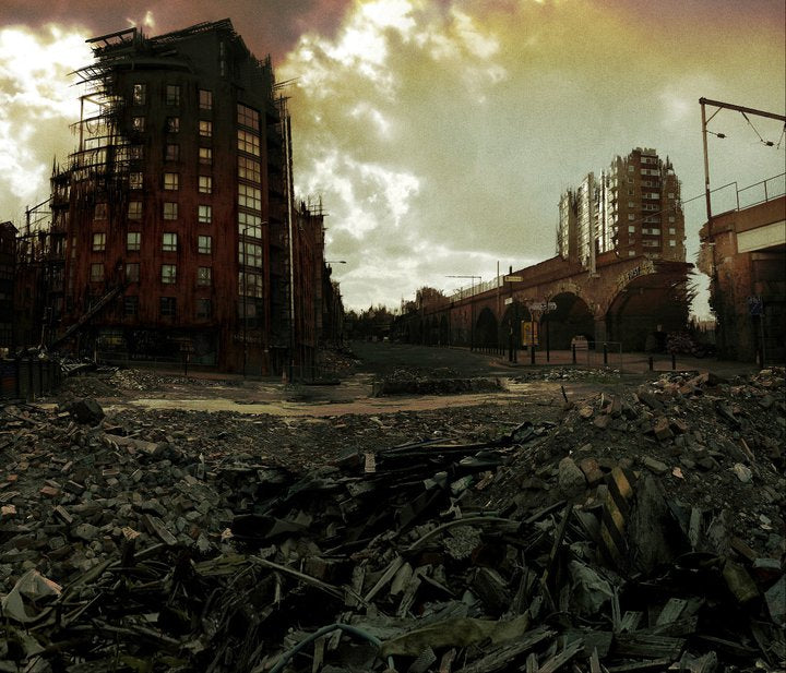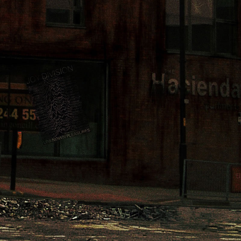 In Chadderton's mixed medium artwork, the Hacienda is reimagined in a post-apocalyptic world. The piece is a collage of various materials, including paint, ink, and found objects, such as broken glass and rusted metal. The use of these materials gives the artwork a gritty and textured feel, evocative of the decay and ruin that would follow an apocalyptic event.