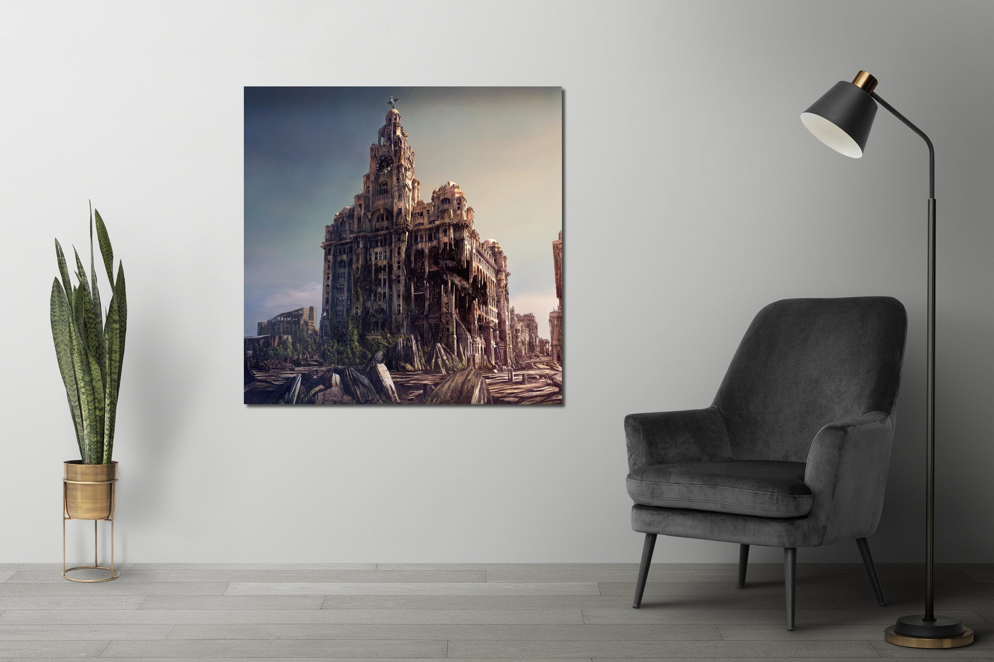 The Liver Building, with its two clock towers and copper domes, is an iconic symbol of Liverpool, representing the city's maritime history and economic strength. Chadderton's artwork challenges this image, depicting the building as a victim of a catastrophic event. The piece reflects a post-apocalyptic world where nature has taken over and humans have disappeared.