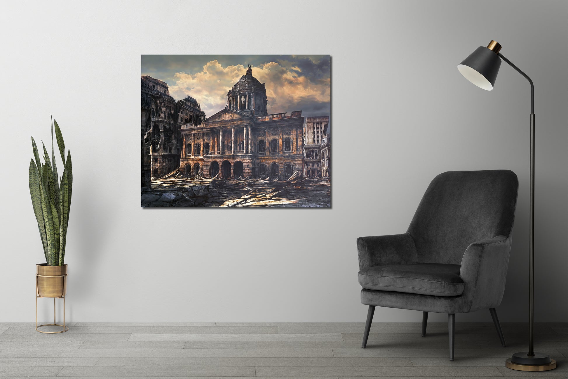 Chadderton's artwork depicts Liverpool's Town Hall in a state of disrepair and abandonment, set in a dystopian future where society has collapsed. The building's once grand and imposing façade is now covered in graffiti, and the windows are shattered, hinting at the destruction that has befallen the city. The surrounding buildings have crumbled, and weeds have overtaken the streets, leaving the Town Hall as the only remaining structure standing.