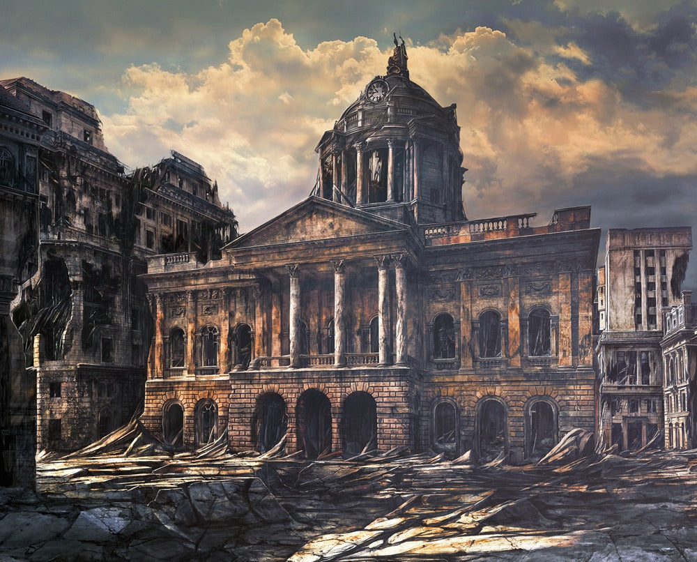 Chadderton's artwork is a stunning example of post-apocalyptic art, depicting a world that has been ravaged by disaster and destruction. However, despite the bleak subject matter, there is a glimmer of hope in the artwork. The Town Hall still stands, a testament to the resilience and strength of humanity. It serves as a beacon of hope for the future, reminding us that even in the darkest of times, there is always the possibility of rebuilding and renewal.