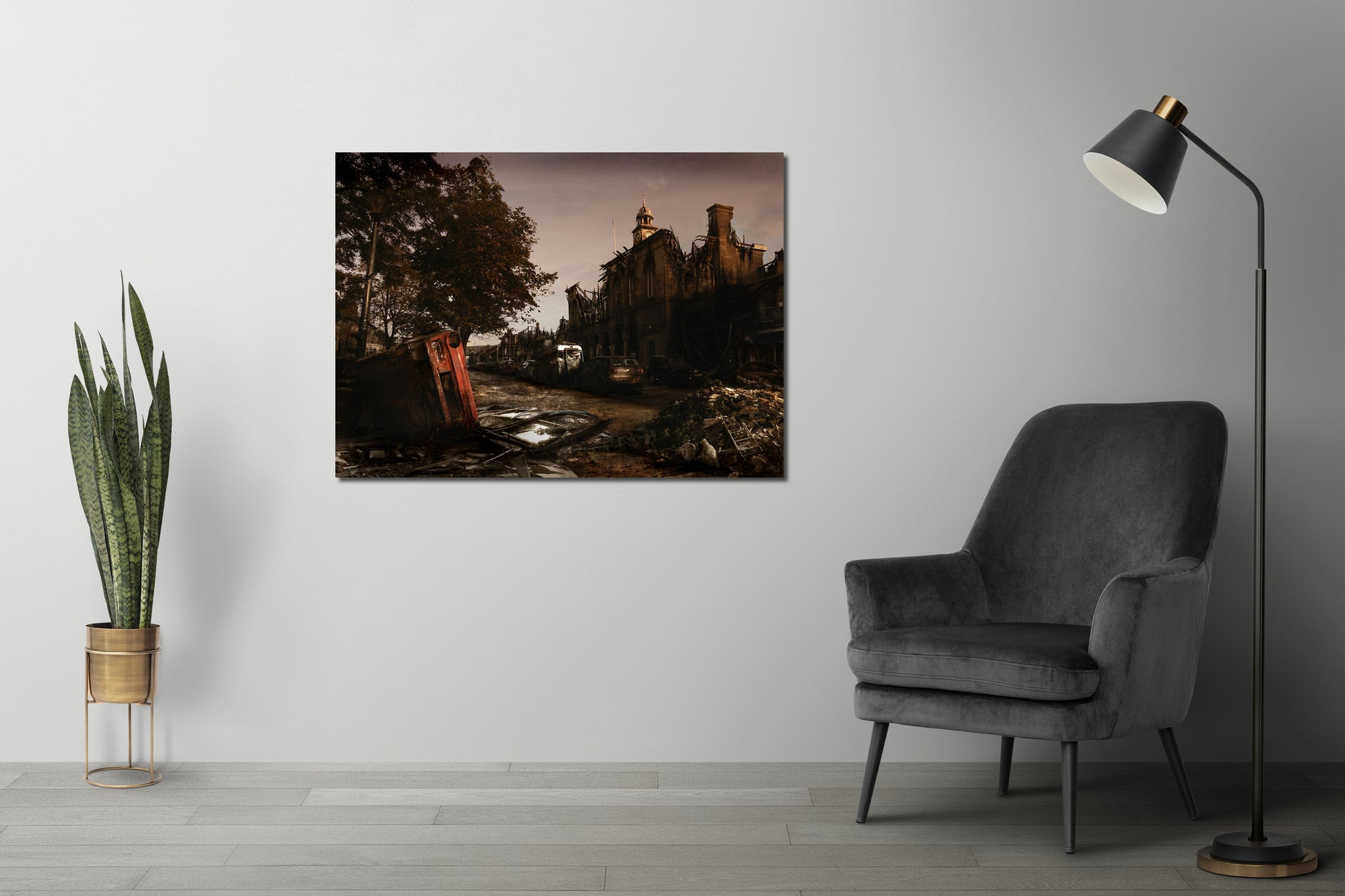 Market Town is a stunning mixed-medium artwork by the talented artist James Chadderton. Inspired by the small Derbyshire town of Glossop, this painting captures the essence of a post-apocalyptic world in a truly unique and captivating way.