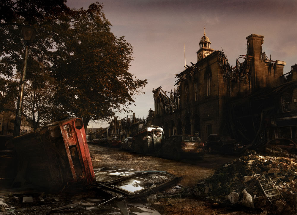 The eerie atmosphere of the post-apocalyptic world is captured perfectly, with the abandoned streets and empty buildings providing a stark contrast to the vibrant colors of the sky. The town square is depicted in incredible detail, with every brick and cobblestone carefully rendered to create a sense of depth and realism.