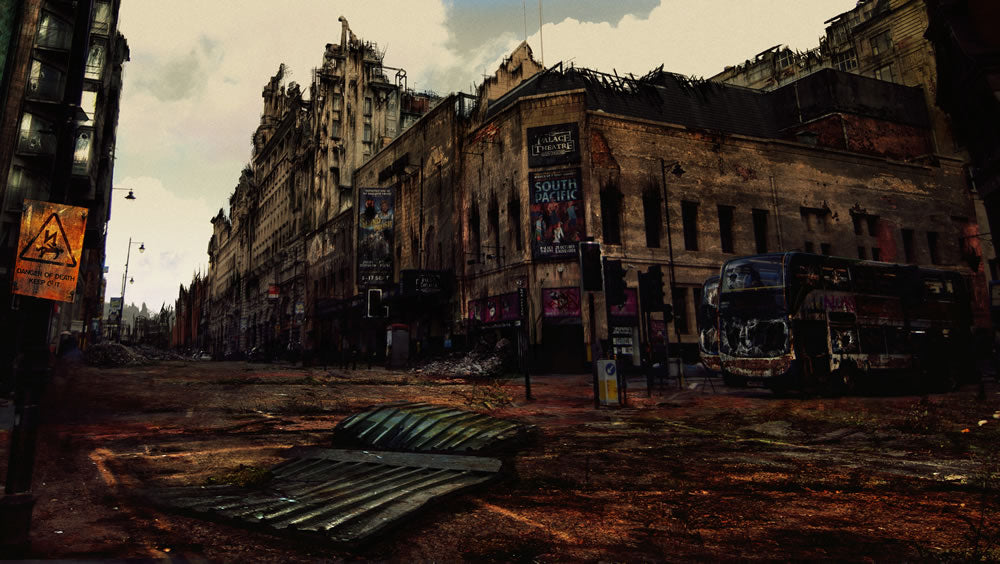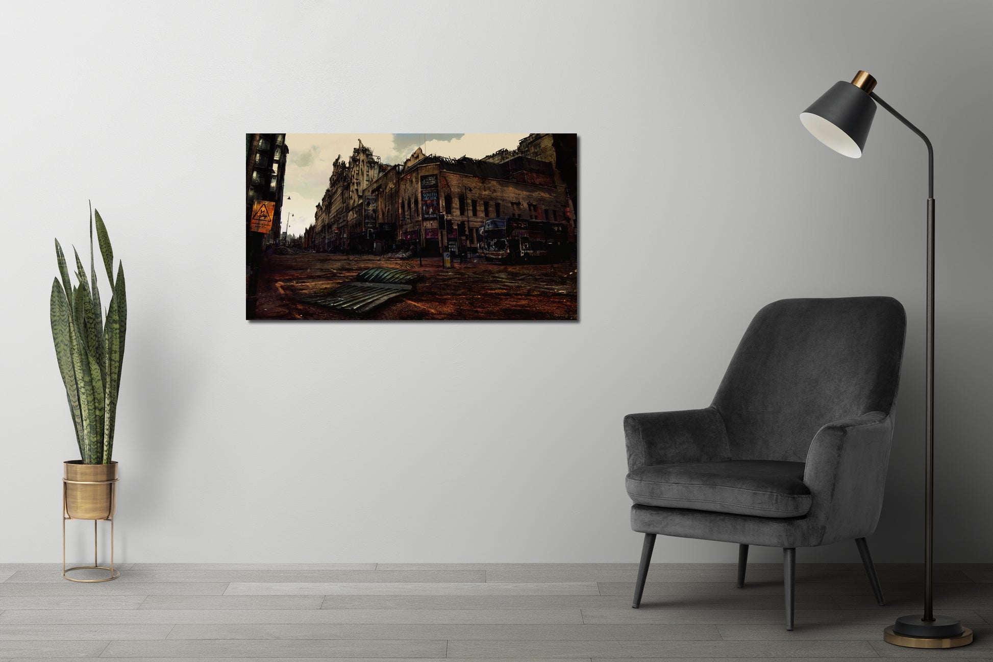 Welcome to the official website showcasing the stunning post-apocalyptic artwork painted by James Chadderton. This incredible piece of art is based on the iconic Palace Theatre in Manchester and has been created in a unique mixed medium style that brings the scene to life in a truly captivating way.