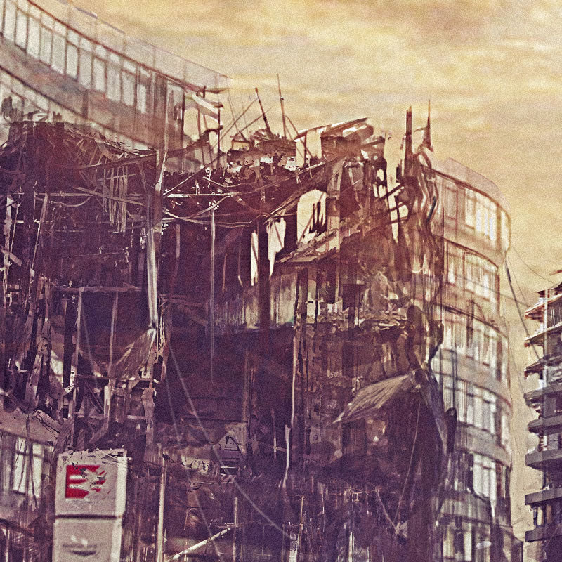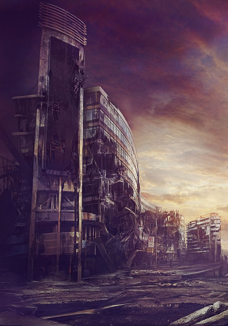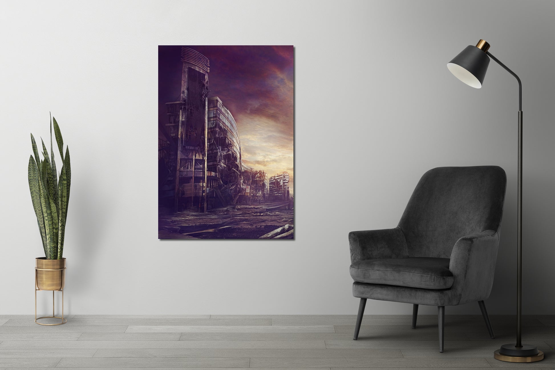 Using his unique mixed-medium style, Chadderton has created a vision of the city after an apocalypse. The once-bustling streets are now abandoned and overgrown with vegetation, while the iconic train station stands alone and neglected in the distance. The sky adds to the eerie atmosphere of the painting.