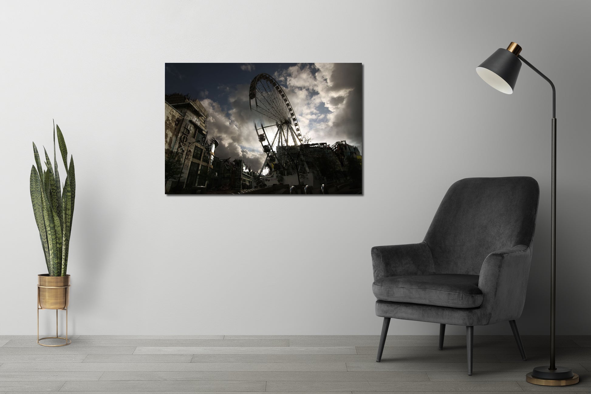 The painting tells a story of a world that has been devastated by an unknown disaster, with the Big Wheel as the last remaining symbol of a once-thriving city. The contrast between the bright colours of the Big Wheel and the desolate surroundings creates a haunting and thought-provoking image.