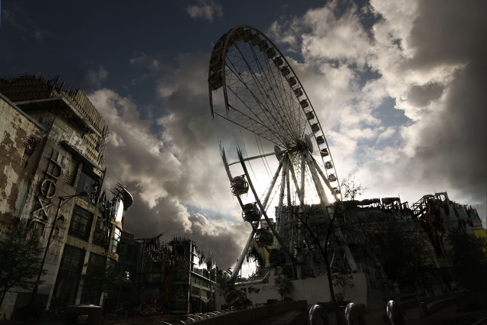 Welcome to the official website showcasing the post-apocalyptic artwork by James Chadderton. This unique piece of art depicts the iconic Big Wheel outside the Selfridges building in Manchester in a post-apocalyptic setting.