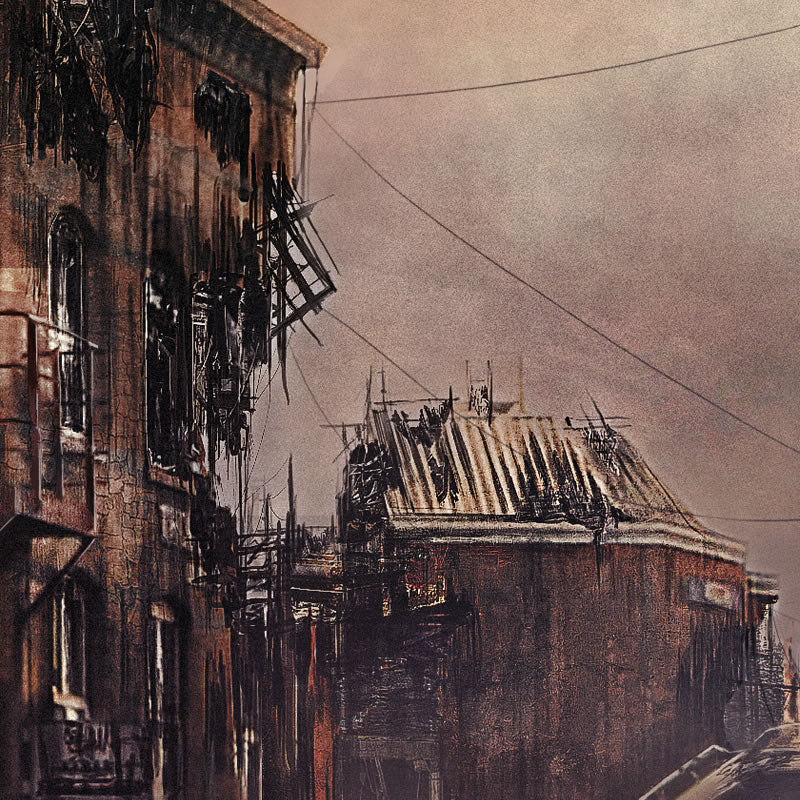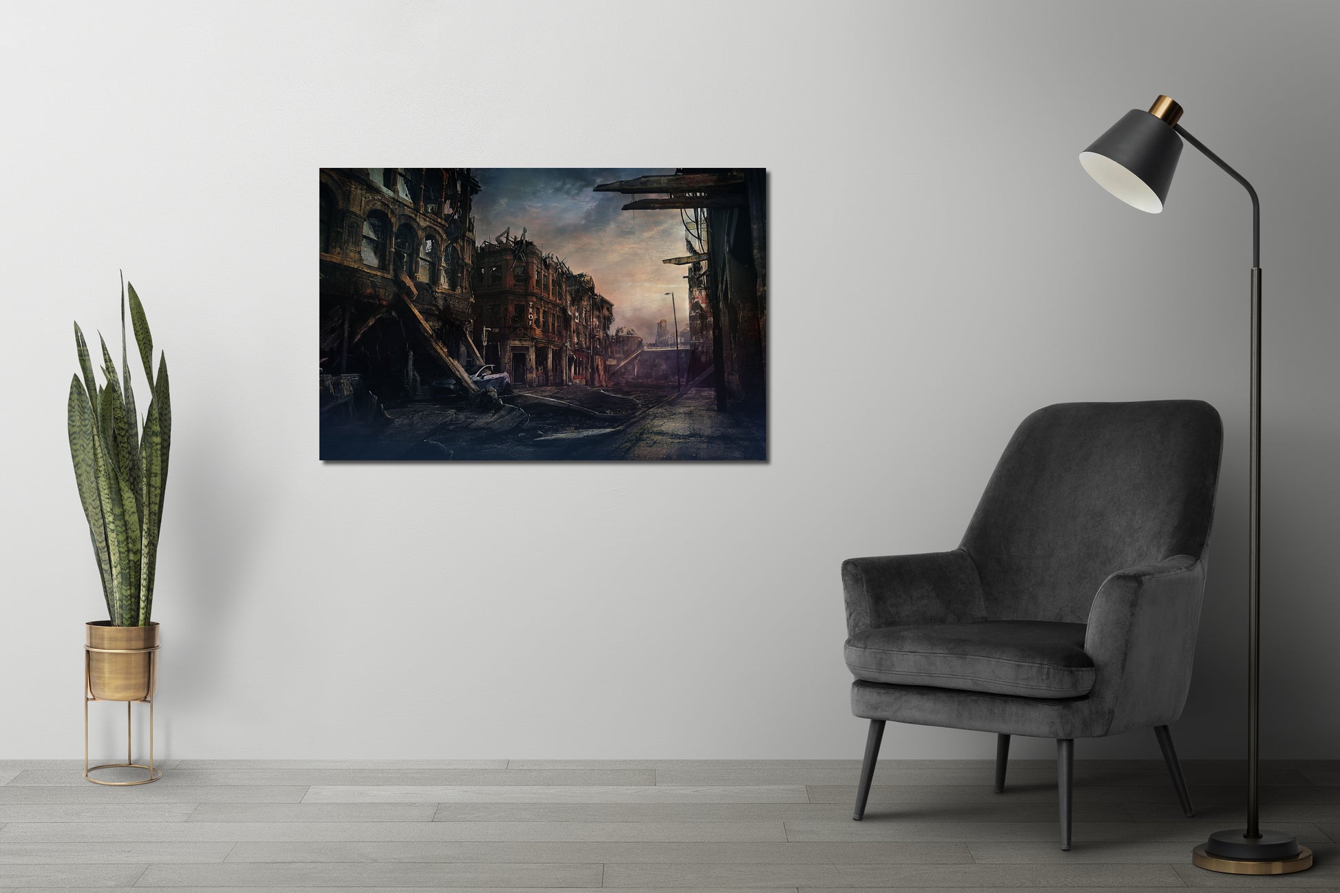 Using a mixed medium style, James Chadderton has created a truly captivating and immersive world that transports the viewer to a dystopian version of Manchester's Northern Quarter. The attention to detail in this artwork is nothing short of extraordinary, as every element, from the broken pavement to the rusted cars, contributes to the overall feeling of desolation and decay.